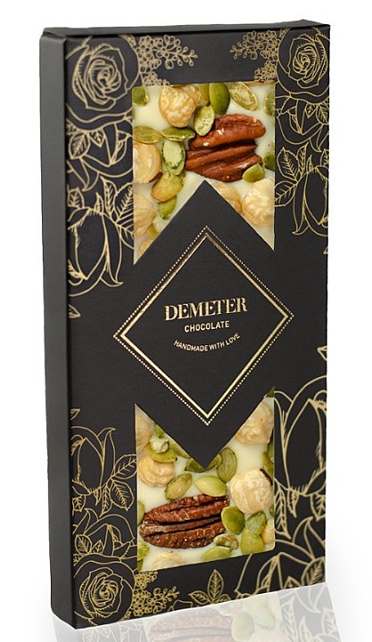 DemeterChocolate Fehércsokoládé pekándióval, tökmaggal és piemonti mogyoróval